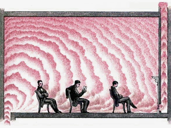 Three illustrations from Lectures on Ventilation—Being a Course Delivered in the Franklin Institute of Philadelphia during the winter of 1866-6, by Lewis W. Leeds, Special Agent of the Quartermaster General for the Ventilation of Government Hospitals during the War and Consulting Engineer of Ventilation and Heating for the US Treasury Department. “Man’s own breath is his greatest enemy.” JOHN WILEY & SON, PUBLISHERS, 1869.